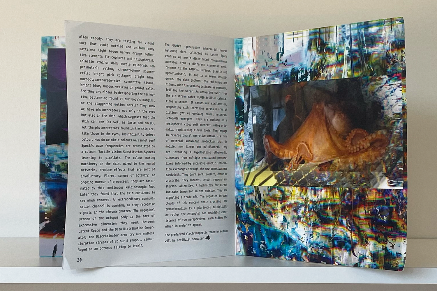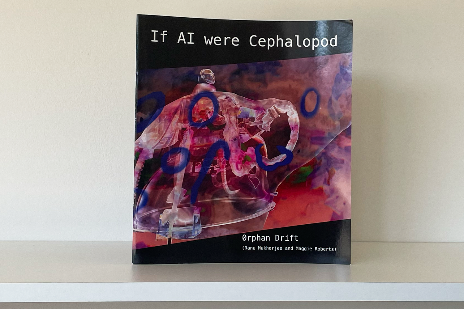 An artist book, published in conjunction with Orphan Drift’s Telematic exhibition, If AI Were Cephalopod, reflecting on the assumptions about the nature of consciousness that inform the development of Artificial Intelligence, and imagining an AI modeled not after the human mind, but rather after the de-centralized, embodied consciousness of the octopus.